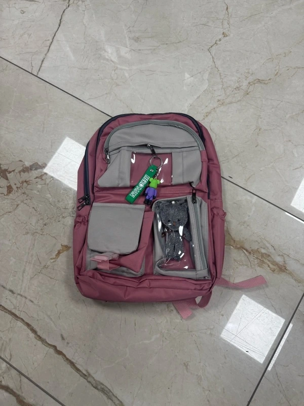2 Gözlü Ayı Model Kore Tarzı İlkokul Sırt Çantası Anahtarlı Açık Pembe