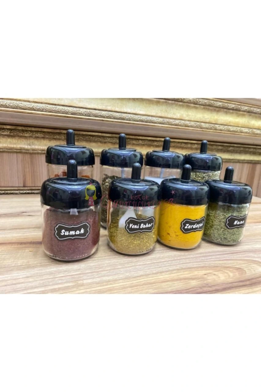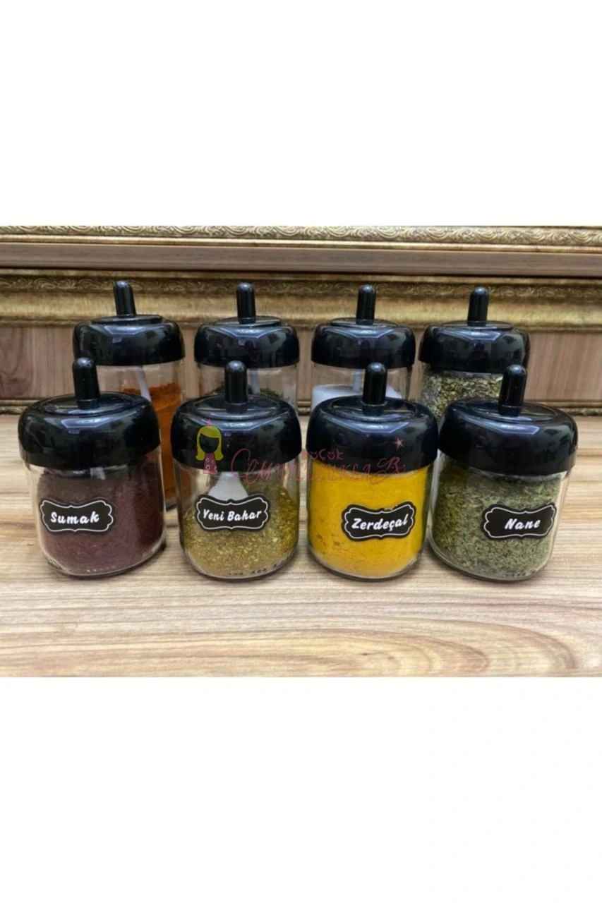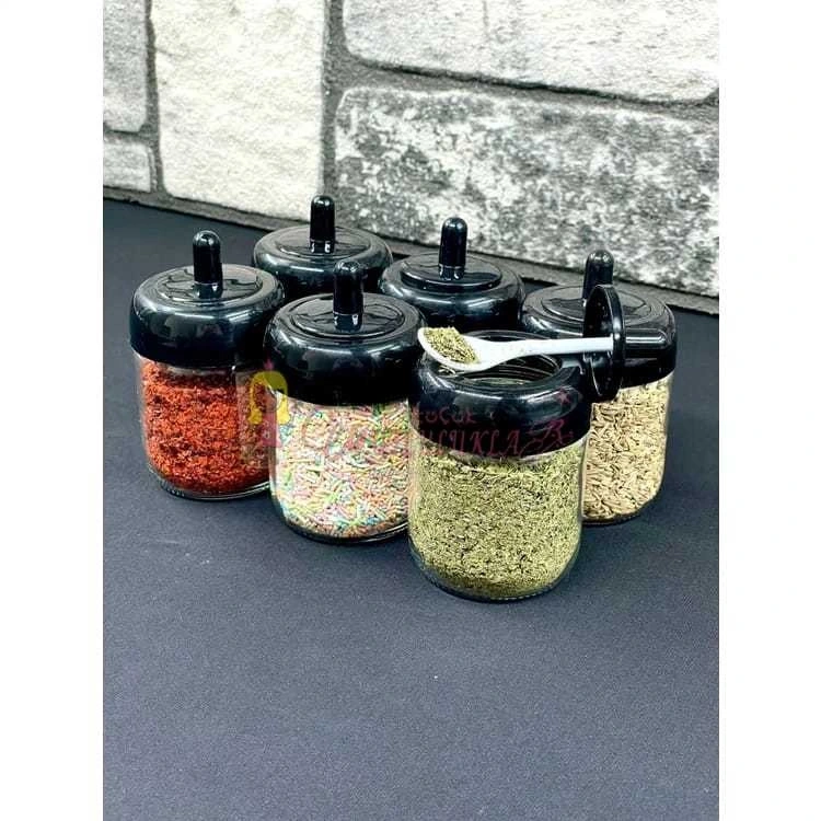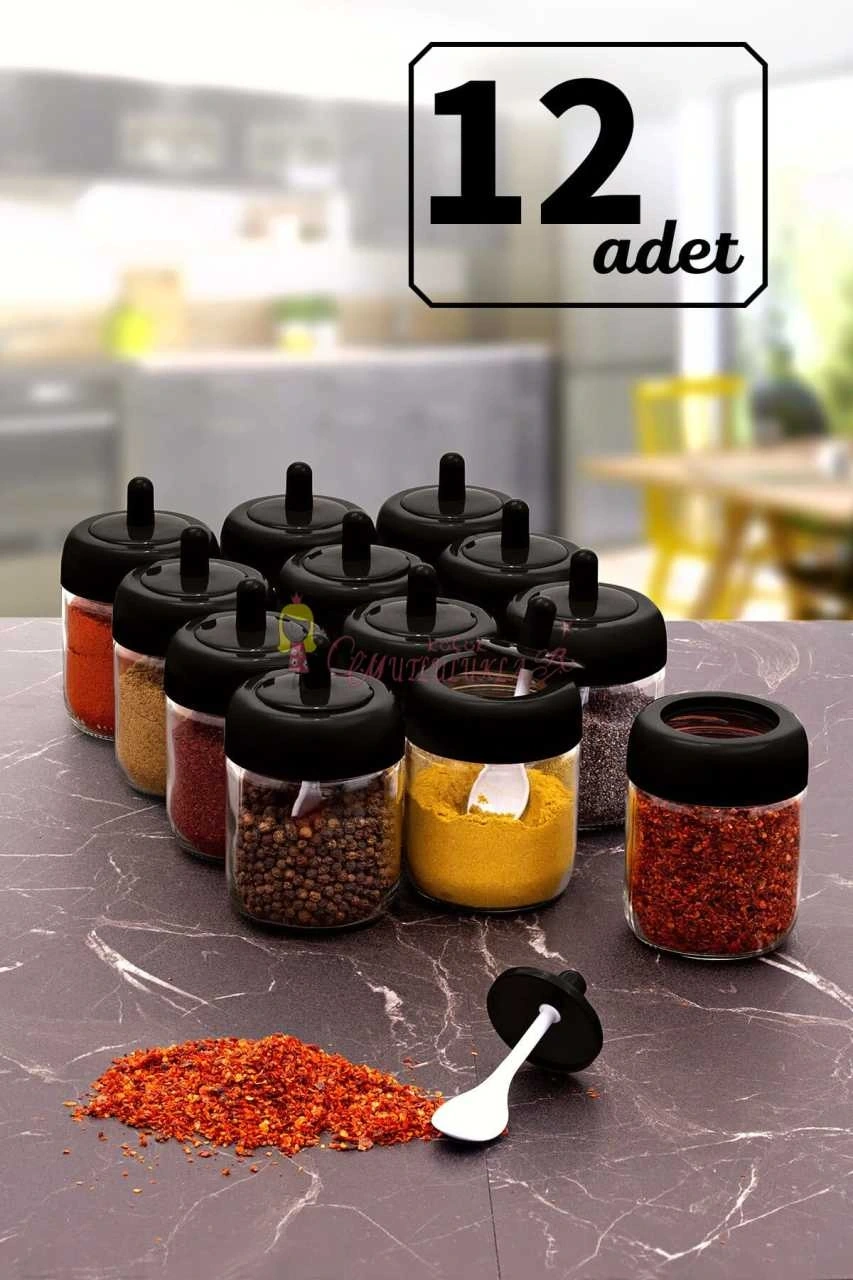 12 Adet Kapağı Kendinden Kaşıklı 200 Ml Cam Baharatlık Seti Siyah