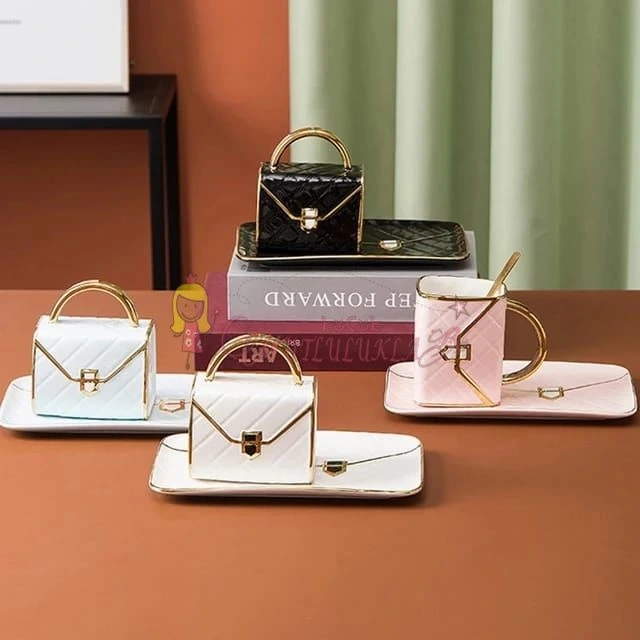 Toz pembe Beyaz ve Siyah renge sahip Türk kahvesi fincan takımı çanta tasarımındadır.
