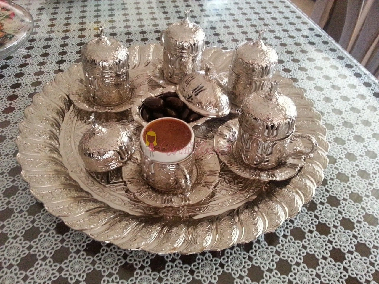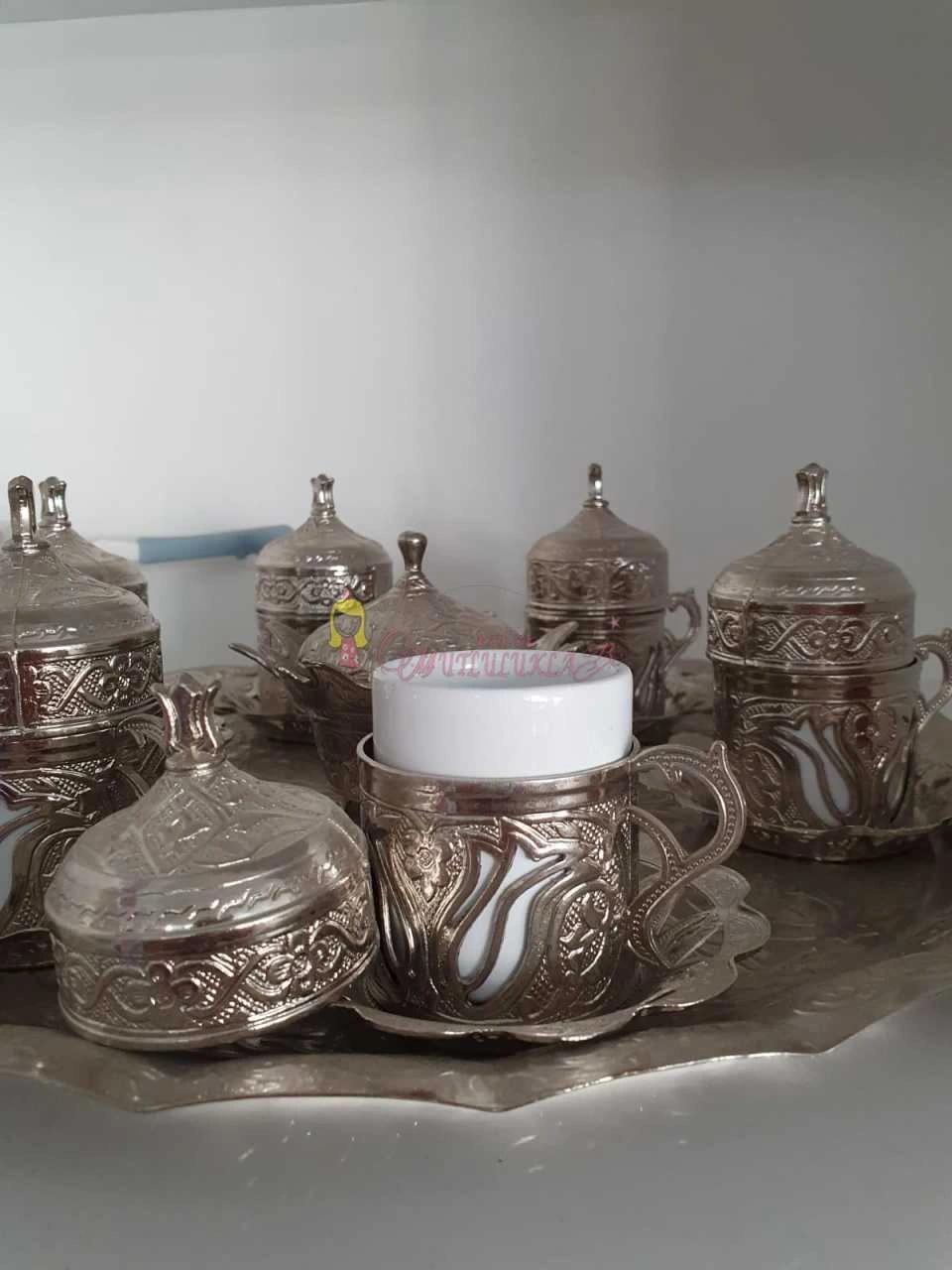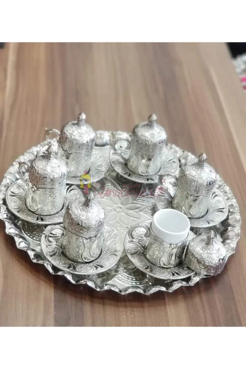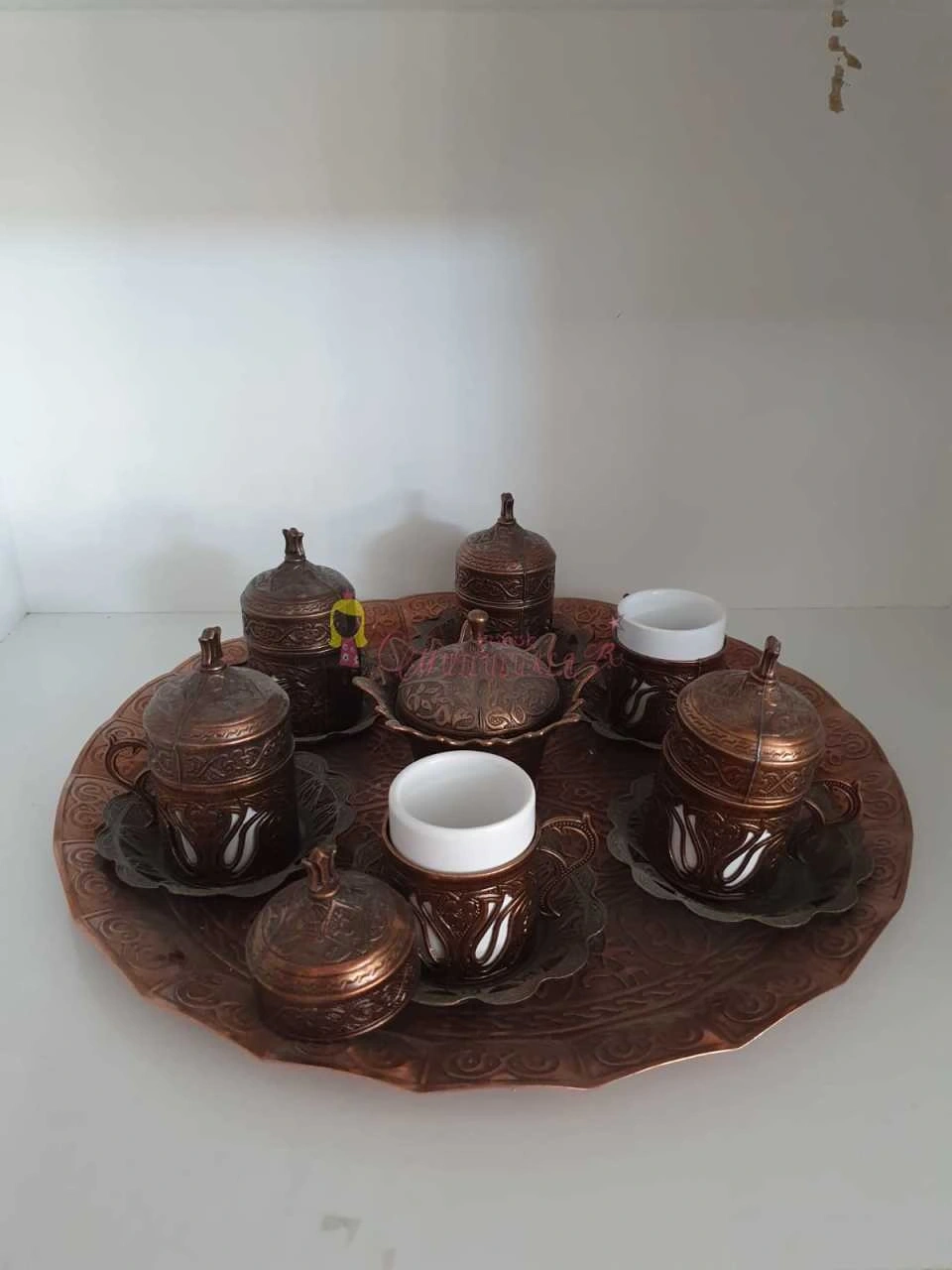 6 kişilik kahve takımı bakır ve nikel karışımı olup geleneksel osmanlı motiflerimizle işlemelidir.