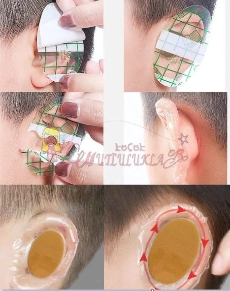 2. Su geçirmez kulak bantını çocuğun kulağını yapıştırın ve beyaz kağıdı yavaşça çıkartın.