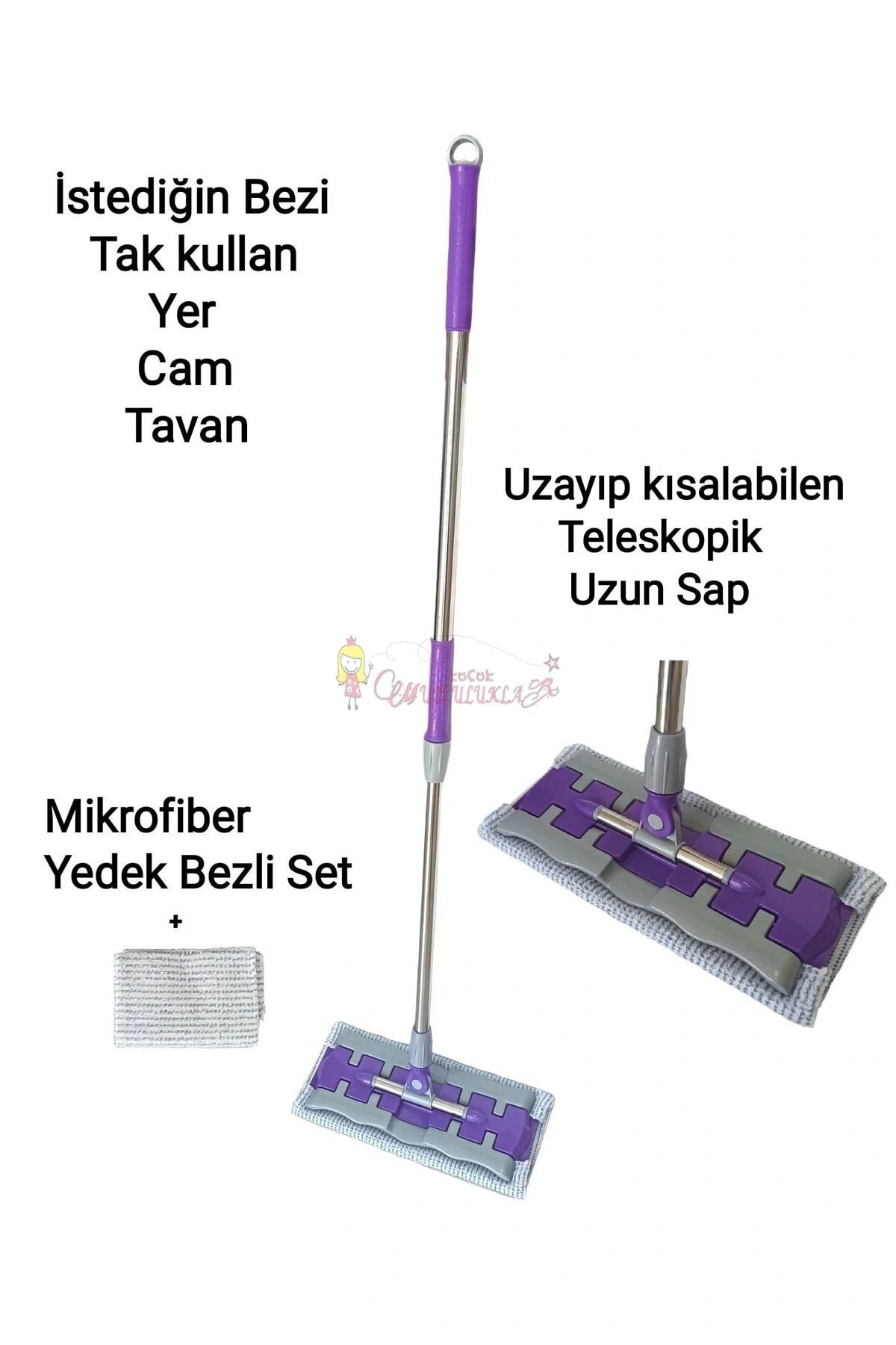 Temizlik yaparken pratik ürünlerle işinizi kolaylaştırmak mümkün! Her beze uyumlu olan bu mop seti, size istediğiniz kullanım kolaylığını sunuyor. Üstelik şimdi cam bezi hediyeli!