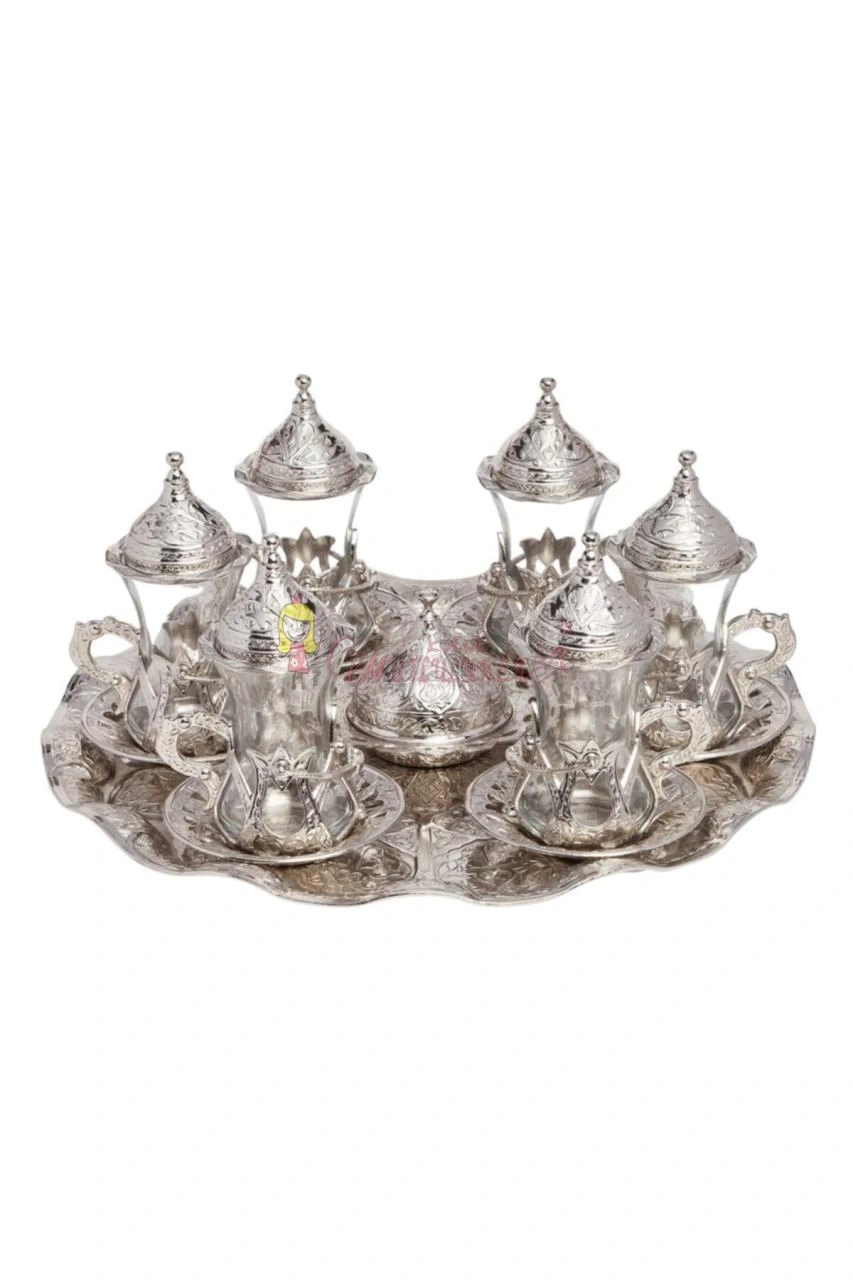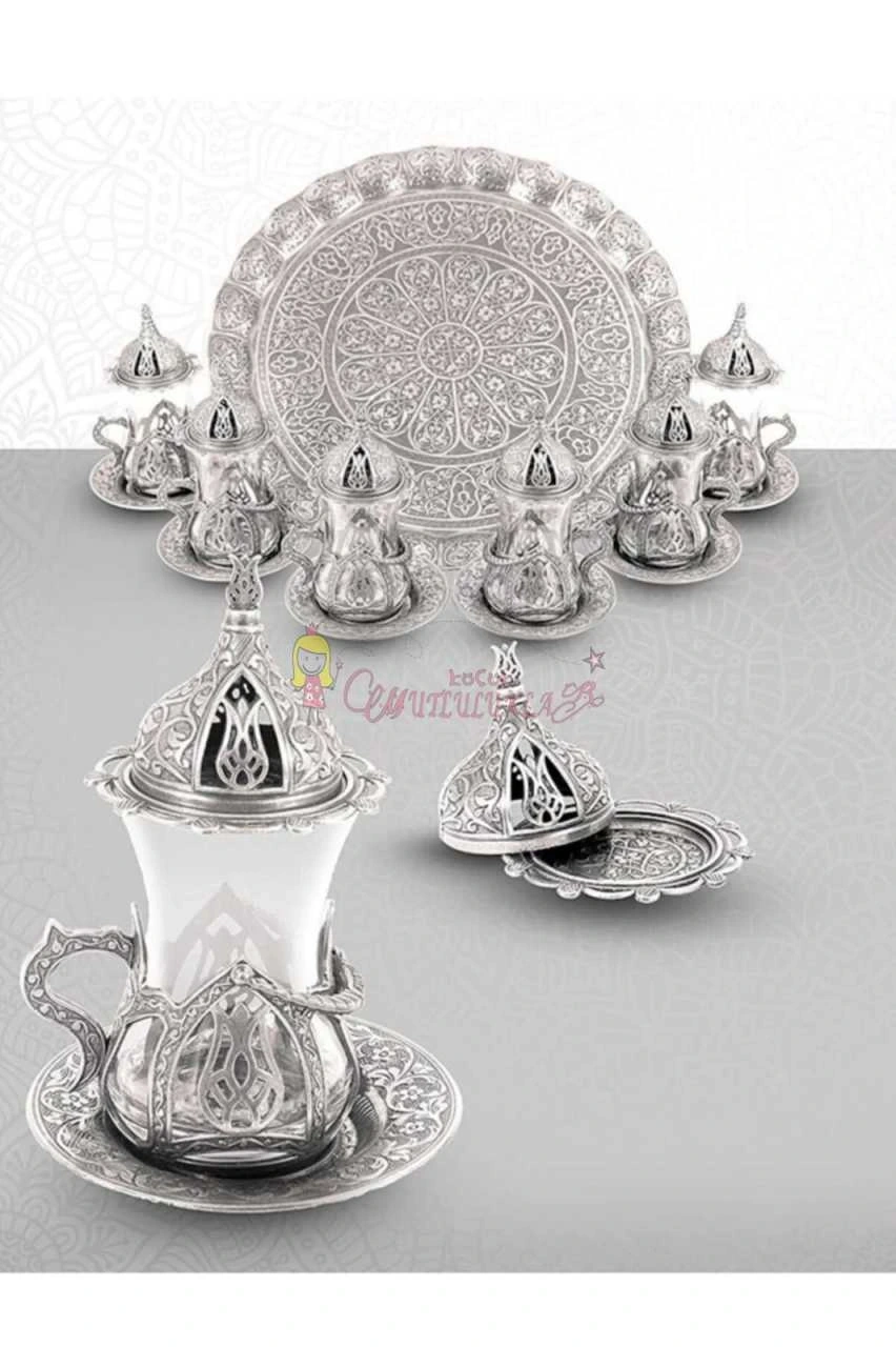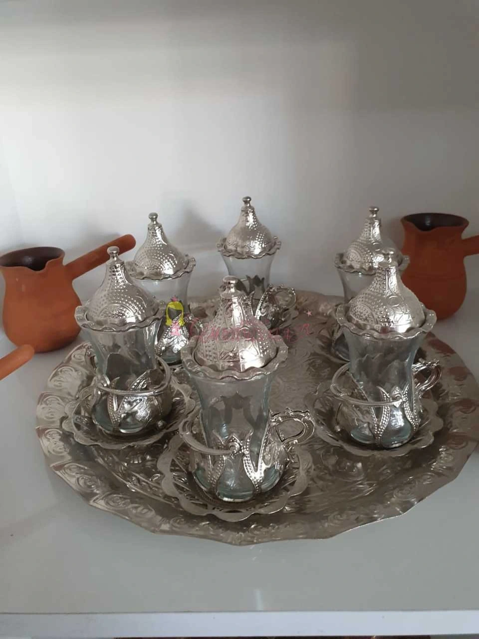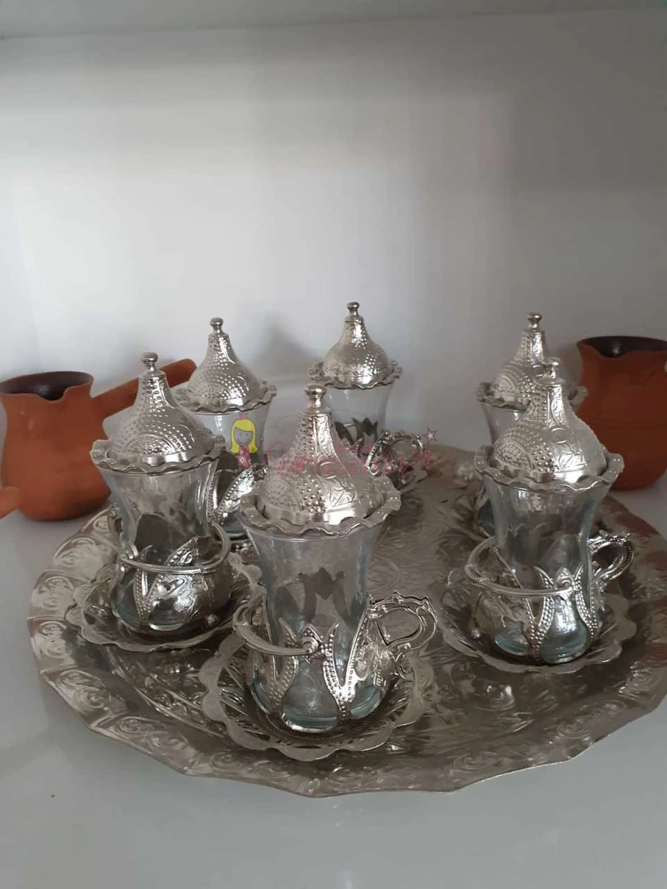 • 6 adet OSMANLI Motifli metal çay bardağı (iç kısmı cam) 6 adet OSMANLI Motifli metal çay tabağı Metal malzeme zamaktır. Kuru bez ile temizlenir. Ürünlerimizi kimyasal içerikli deterjan vb. temizlik maddeleriyle silmemeye dikkat gösterin. Bulaşık makinesinde yıkanmazlar. Islak, nemli ve güneşli ortamda bırakılmamalıdır.