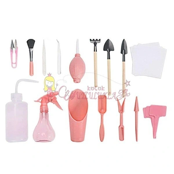 16 Parça Minyatür bahçe aletleri seti Bitki Ekim ve Bakım Seti plastik, ahşap, demir, kauçuk, paslanmaz çelik malzemelerden yapılmıştır.