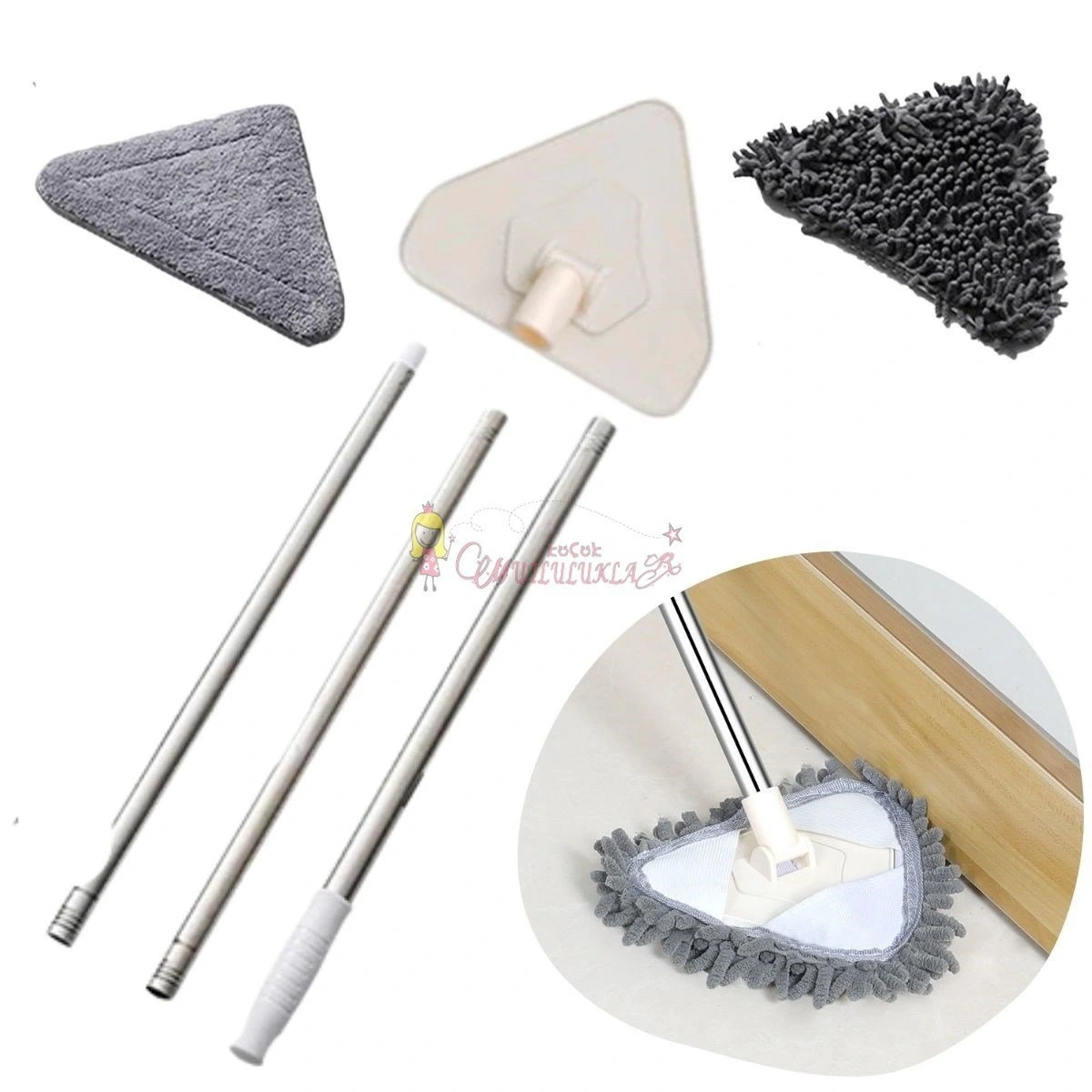 Özel mikrofiber bezi ve çekpası sayesinde cam temizliği yapmak artık çok kolay Üçgen başlık tasarımı 360 derece hareket edebilir, tüm köşeleri el değmeden temizleyebilir, kurulayabilirsiniz.