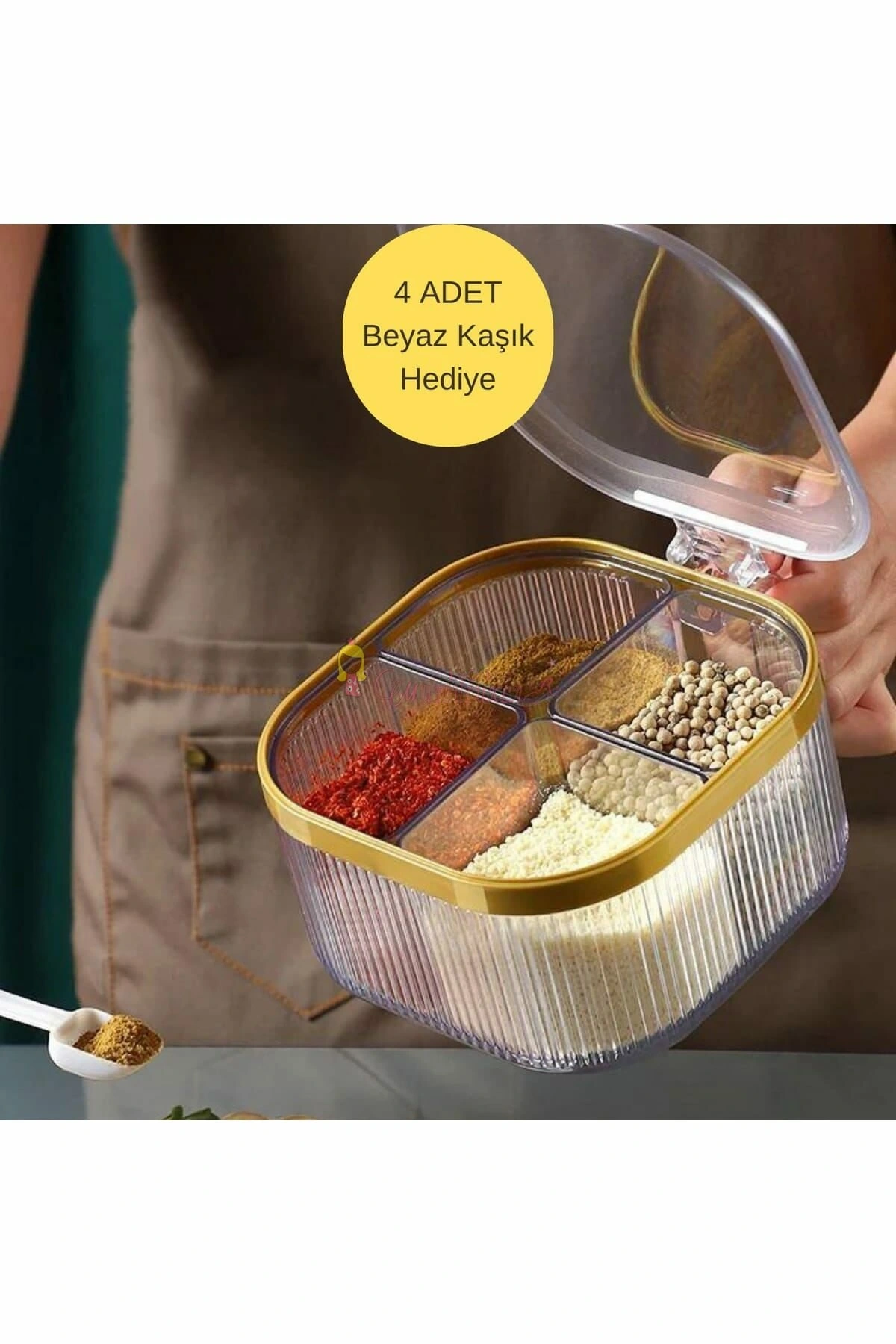 4 Bölmeli Gold Detaylı Kaşıklı Baharatlık Kapaklı
