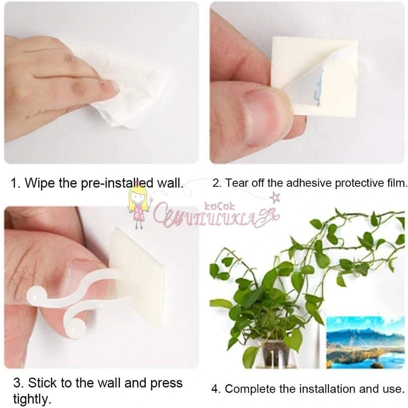 Bitki klipsi kullanımı kolay olacak şekilde tasarlanmıştır. Sadece bitki klipsini yavaşça açın, bitki asmasını klipsin üzerine yerleştirin, sabitleyin ve bitki klipsini aletsiz duvara yapıştırın.