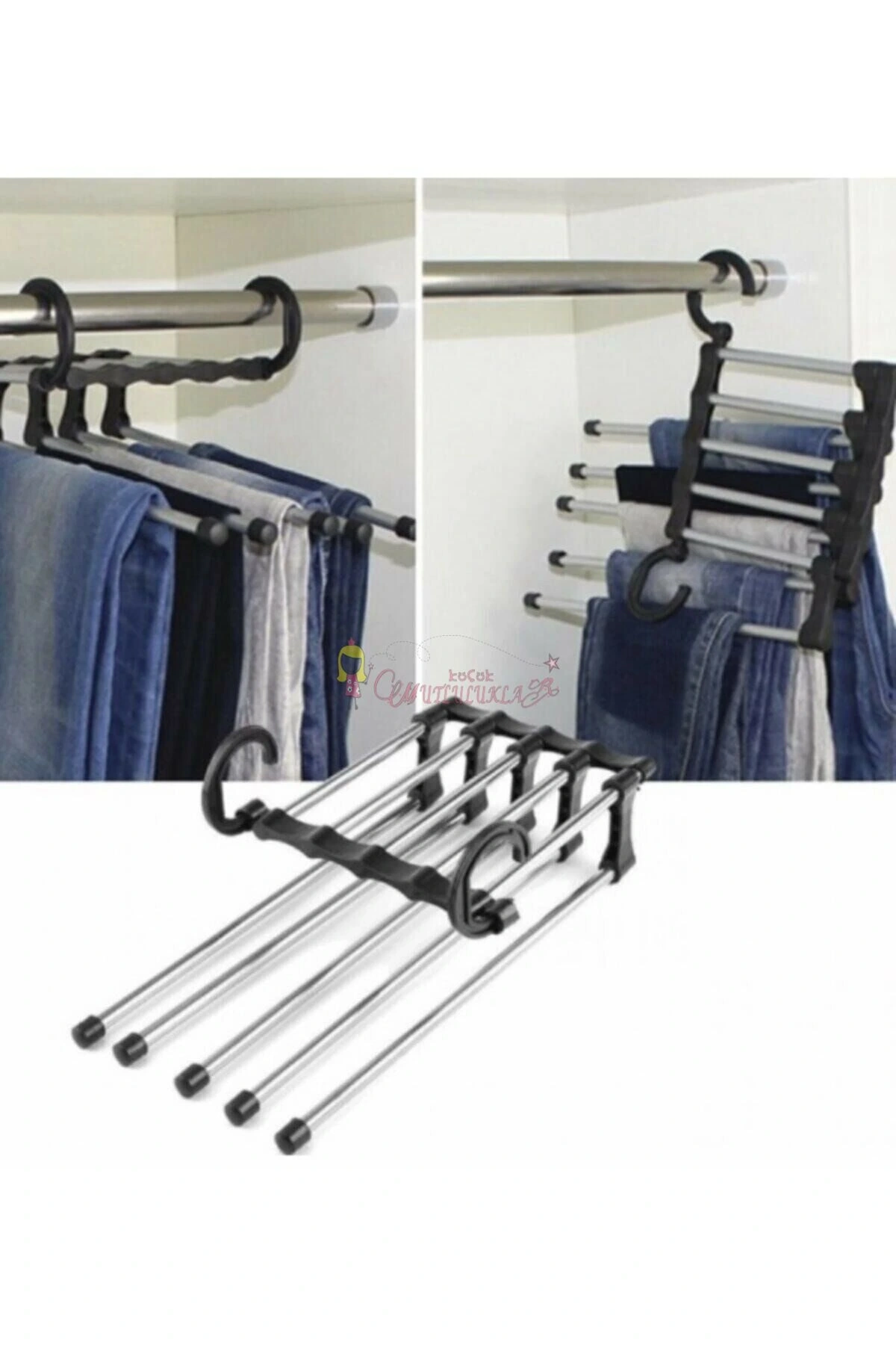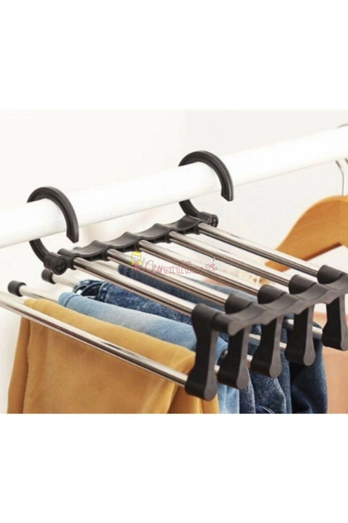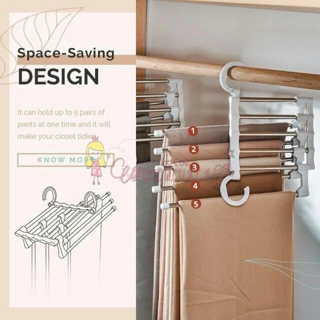 • Krom askıları uzatarak tek tek pantolonlarınıza kolayca erişebilirsiniz. Böylece diğer pantolonlarınız buruşmaz.