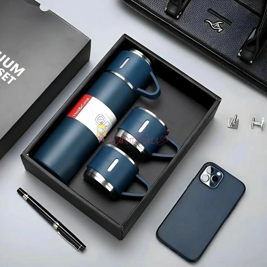 Paslanmaz Çelik Termos Renk 3 Bardaklı Termos Seti Vakumlu Termos Set Çanta Hediyeli